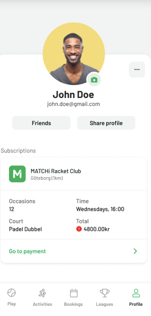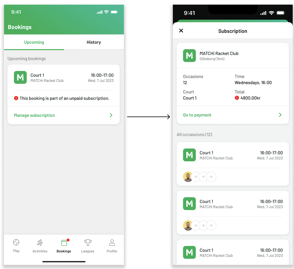 If a venue has created a subscription for you, and you haven't made the payment yet, you can access the checkout in two ways. You can either go to the payment from the subscription card in your profile or navigate from a subscription occasion in the bookings tab to the subscription overview.