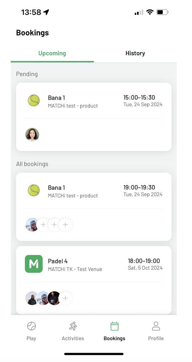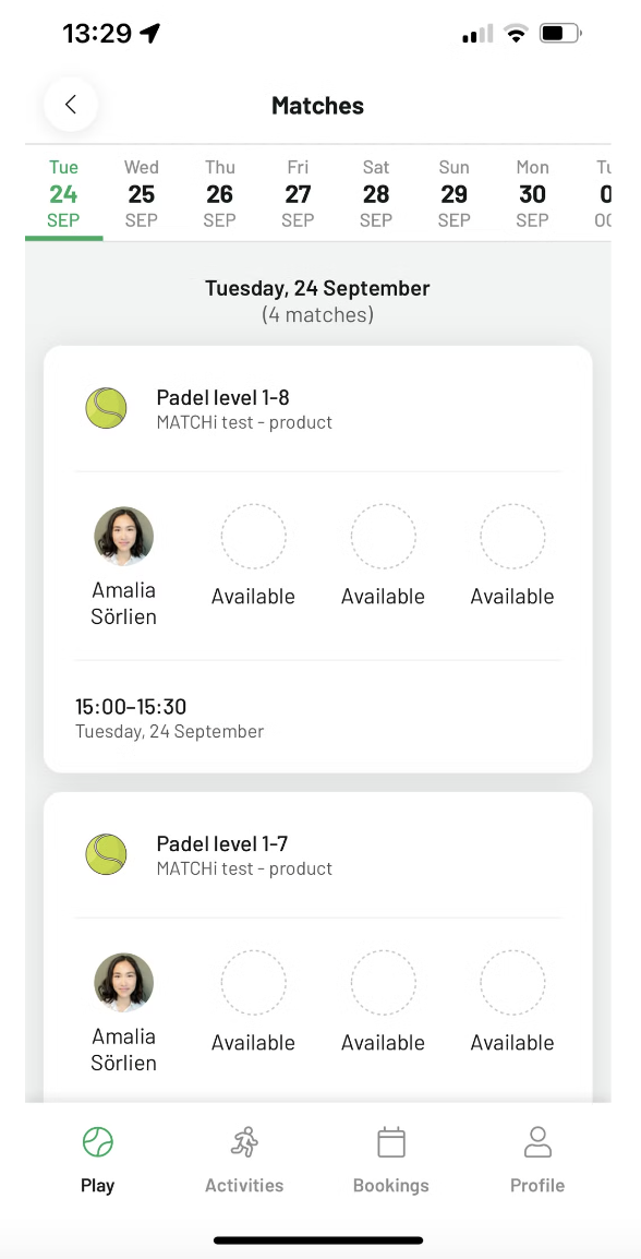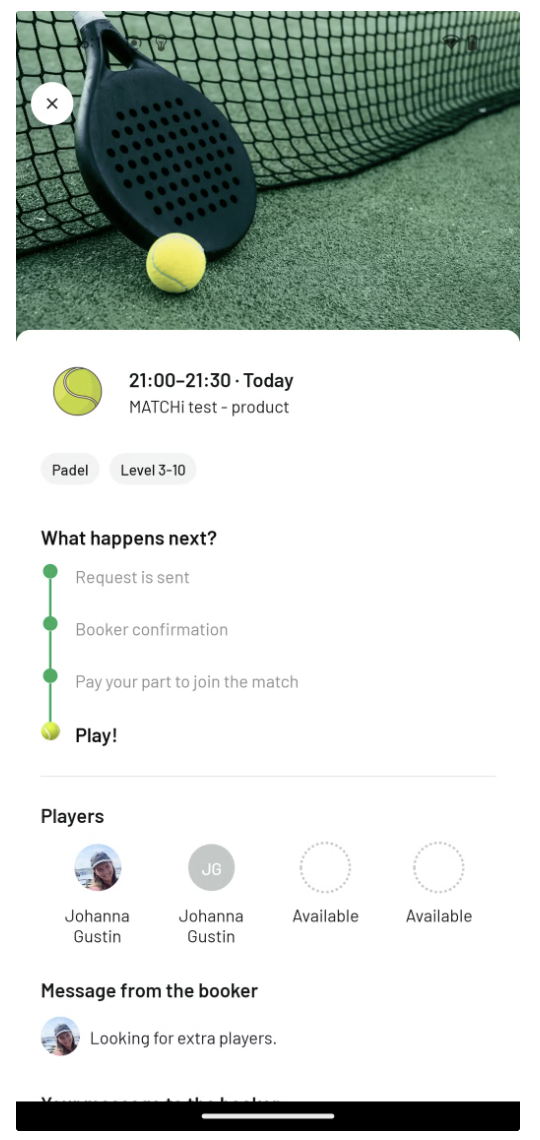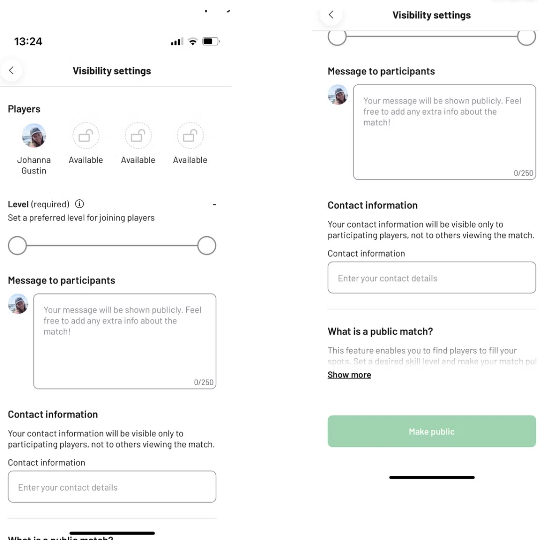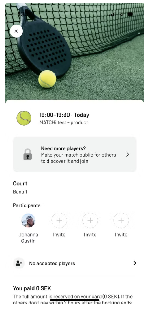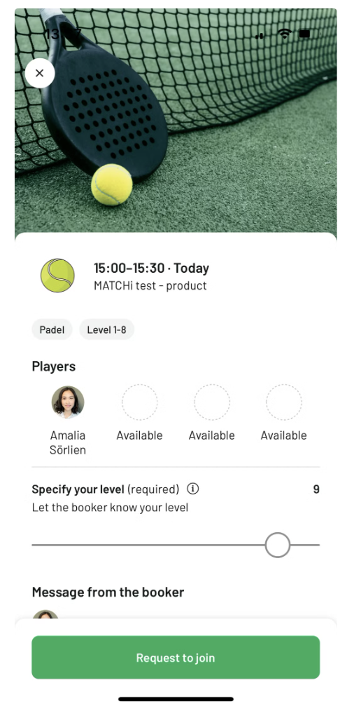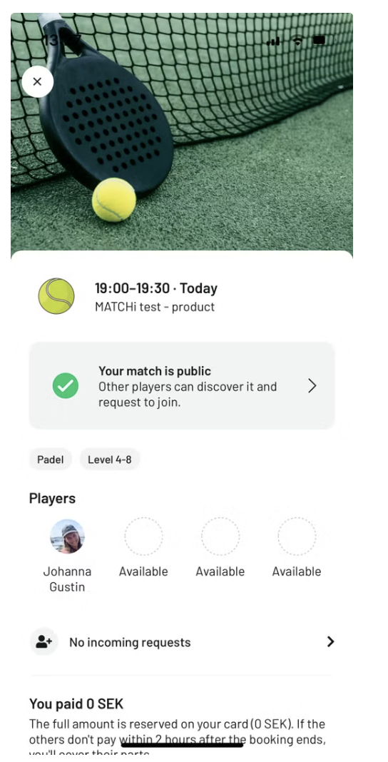 Om du saknar spelare till en match kan du nu göra bokningen offentlig så att andra spelare i MATCHi kan upptäcka den. Du sätter ett nivåintervall för matchen, och andra kan fråga om att få gå med genom att ange sin nivå. Som bokare har du full kontroll över vilka som accepteras eller nekas till din match. Detta hjälper dig att fylla dina matcher med spelare på samma nivå och förhoppningsvis kan du spela mer!